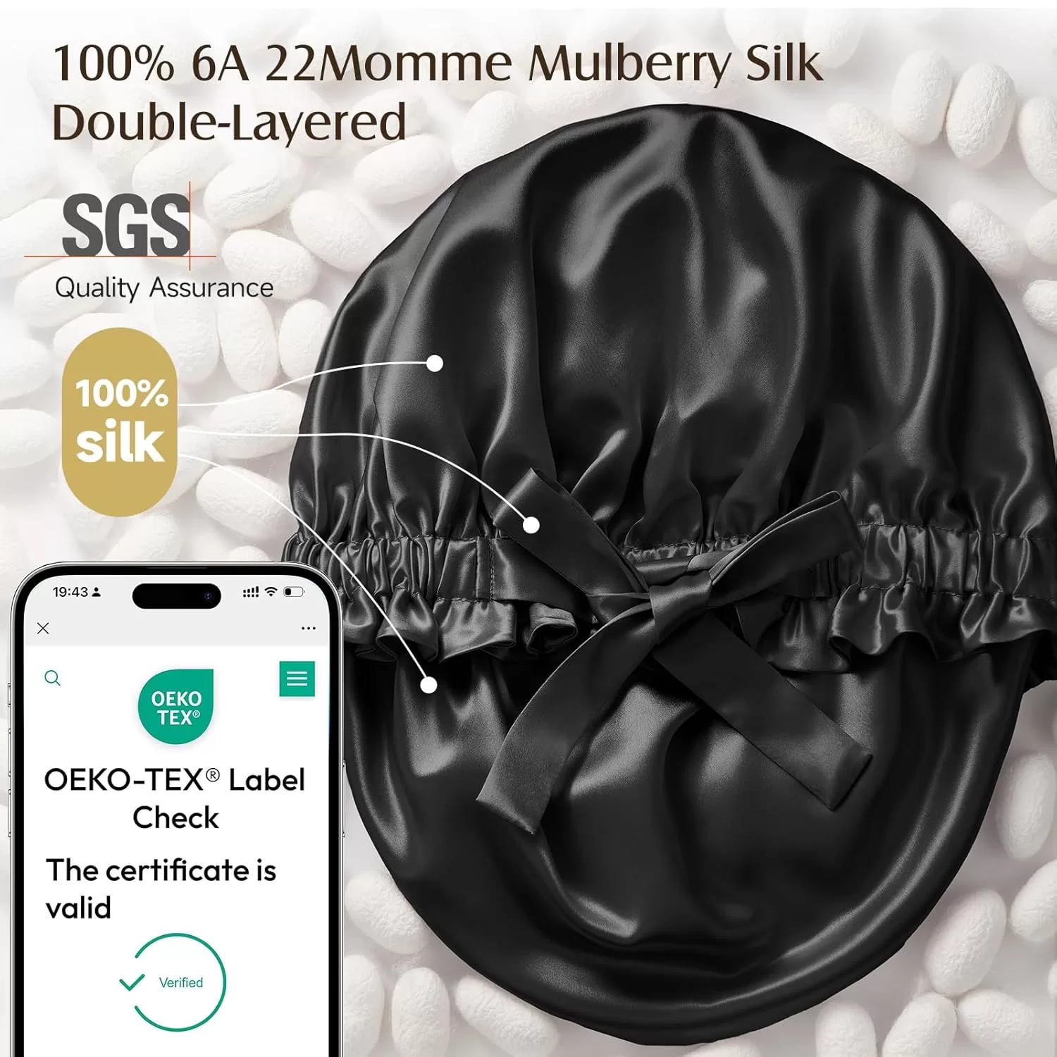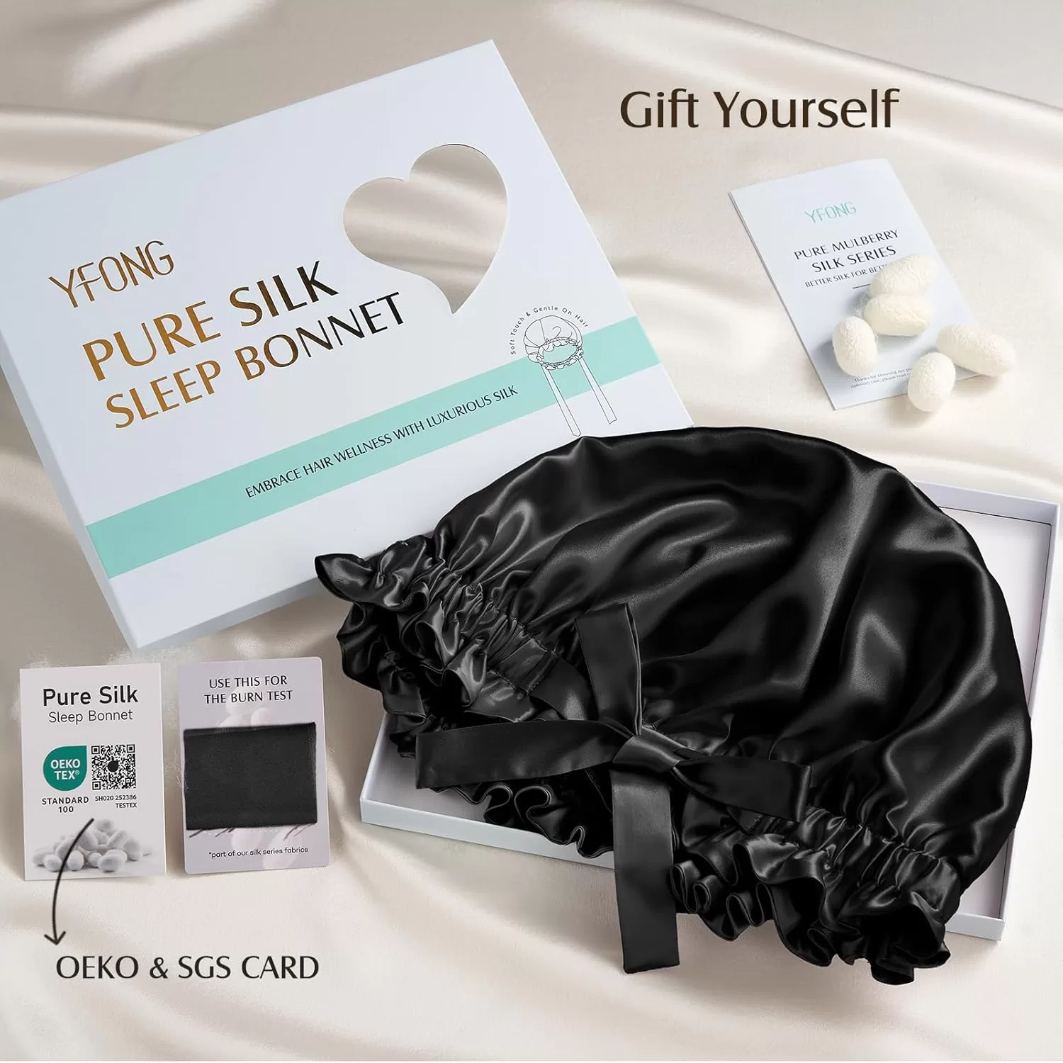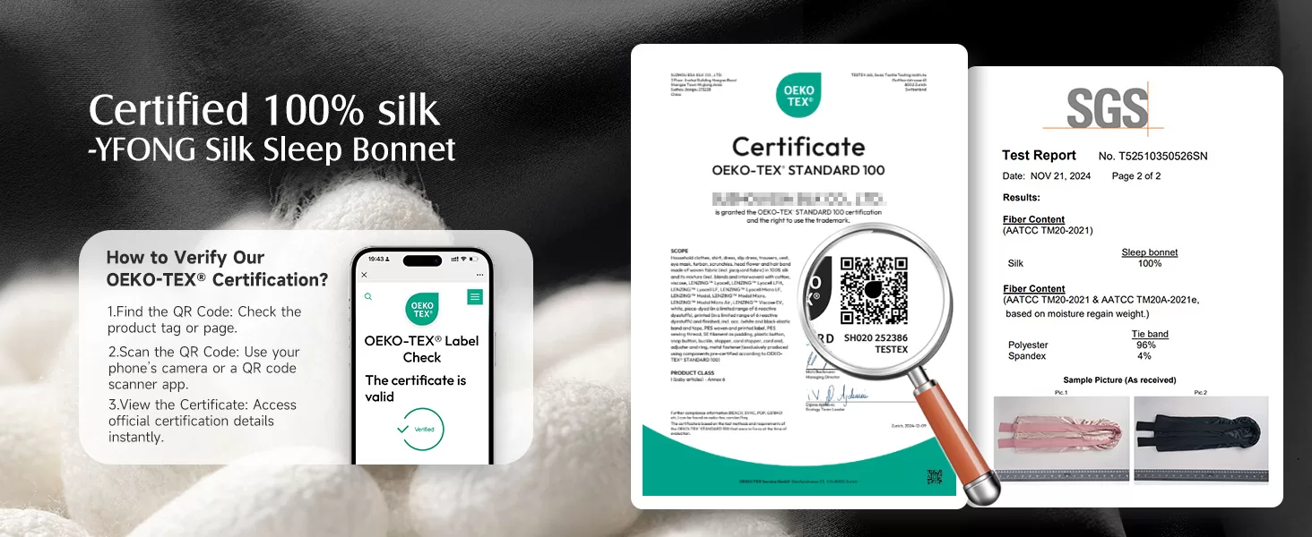 • Luxurious 100% Pure Mulberry Silk Bonnet, No Other Fabric Added: YFONG double layers silk bonnet (Outer & Inner Layers & Straps) are all made of the highest grade 6A 22 momme mulberry silk. Natural silk fabric and double-layered design create a smooth, soft, lightweight, comfortable and lustrous bonnet, offering unmatched comfort and double hair protection. The fabric of our pure silk bonnet has passed the SGS authentication & OEKO certified, ensures real silk and harmless.