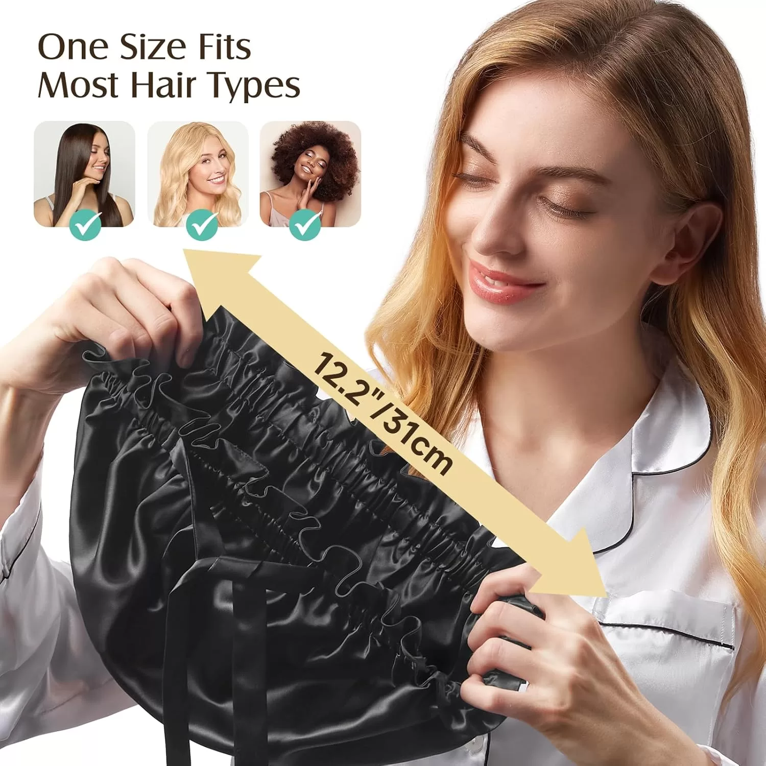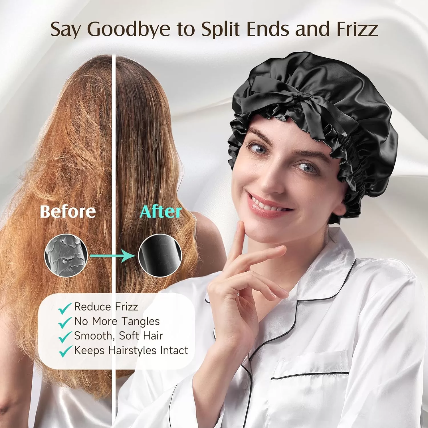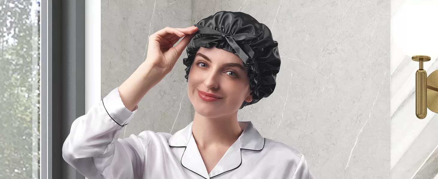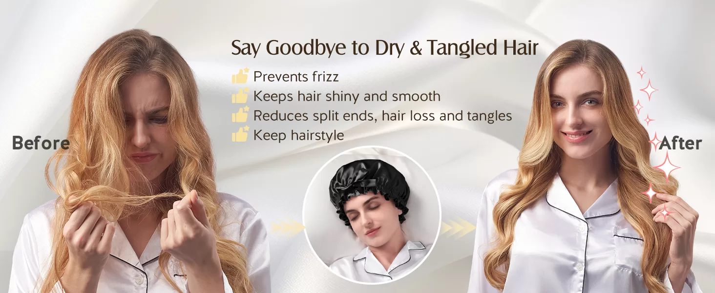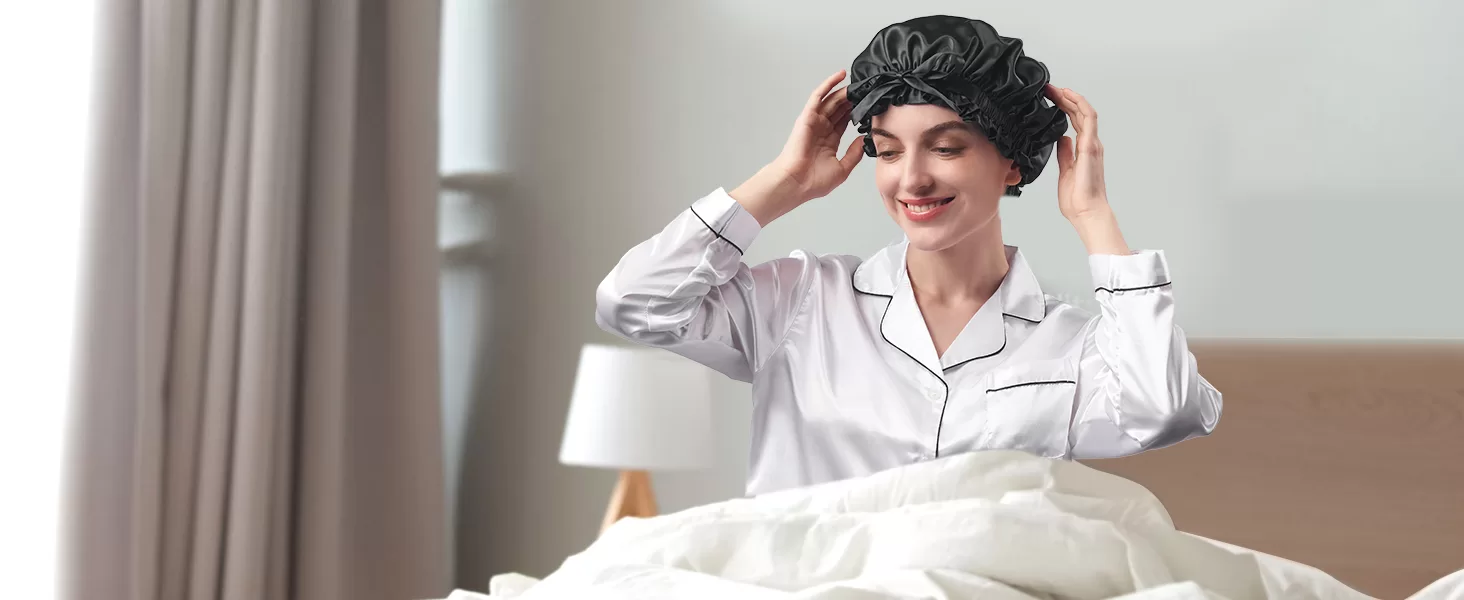 The silk hair bonnet is natural silk fiber which can reduce hair frizz, breakage, maintains moisture, and keeps hairstyle intact, a luxurious feel.