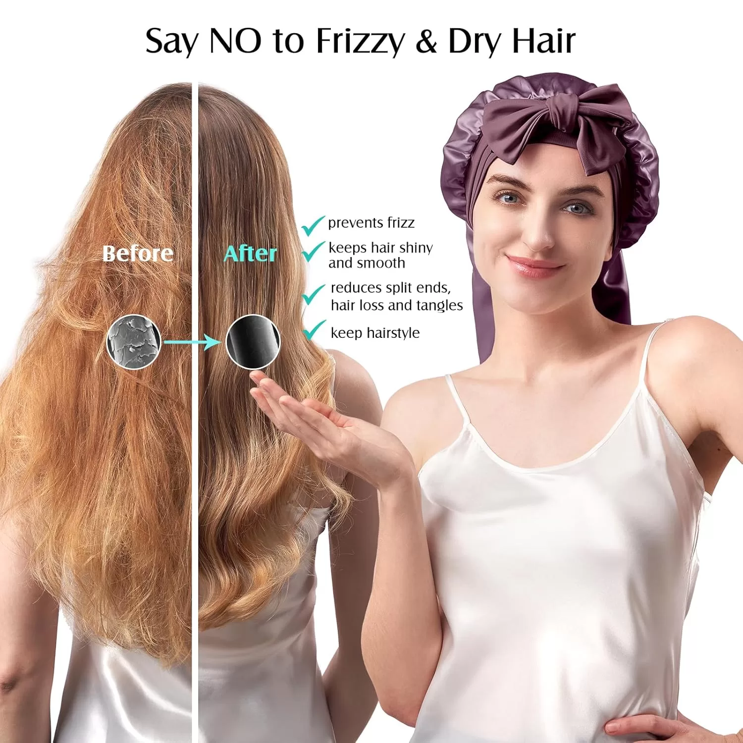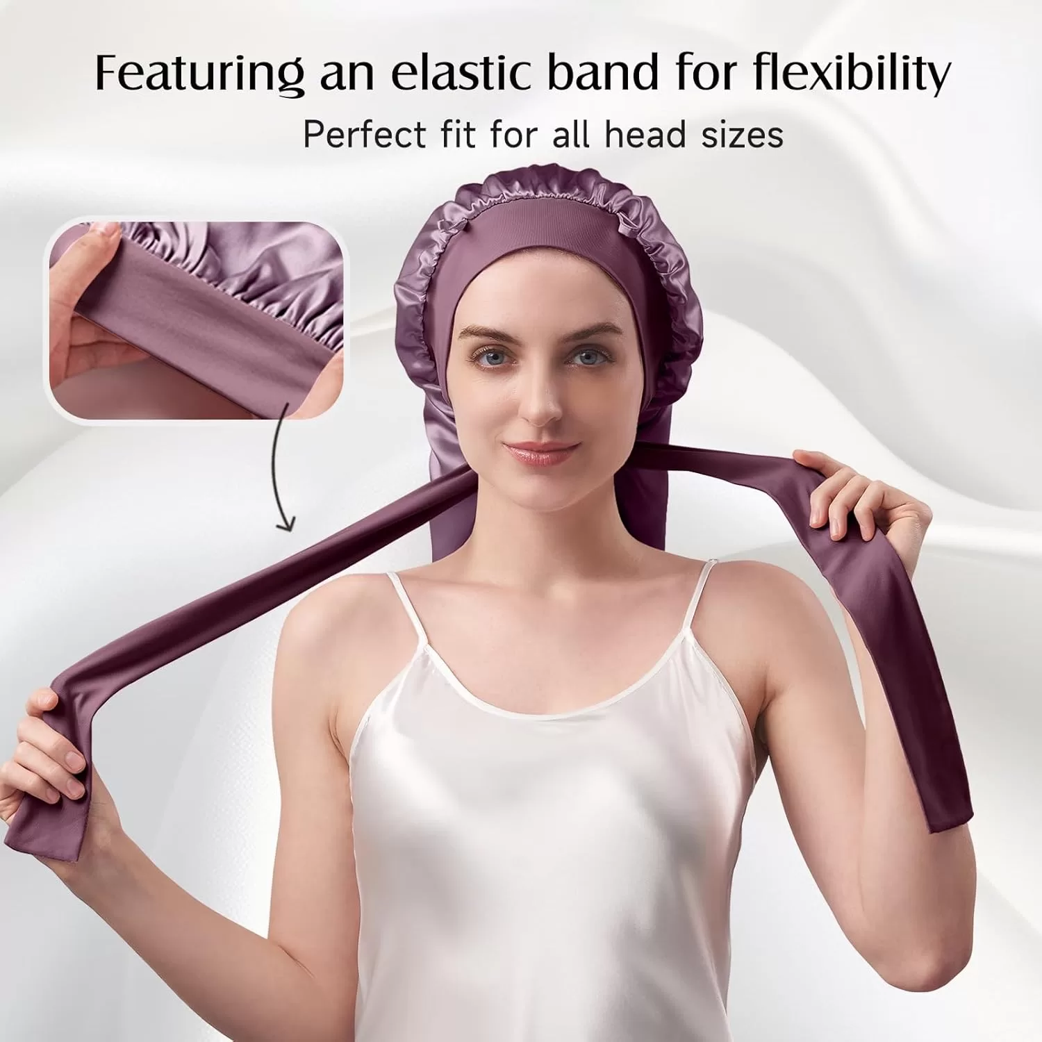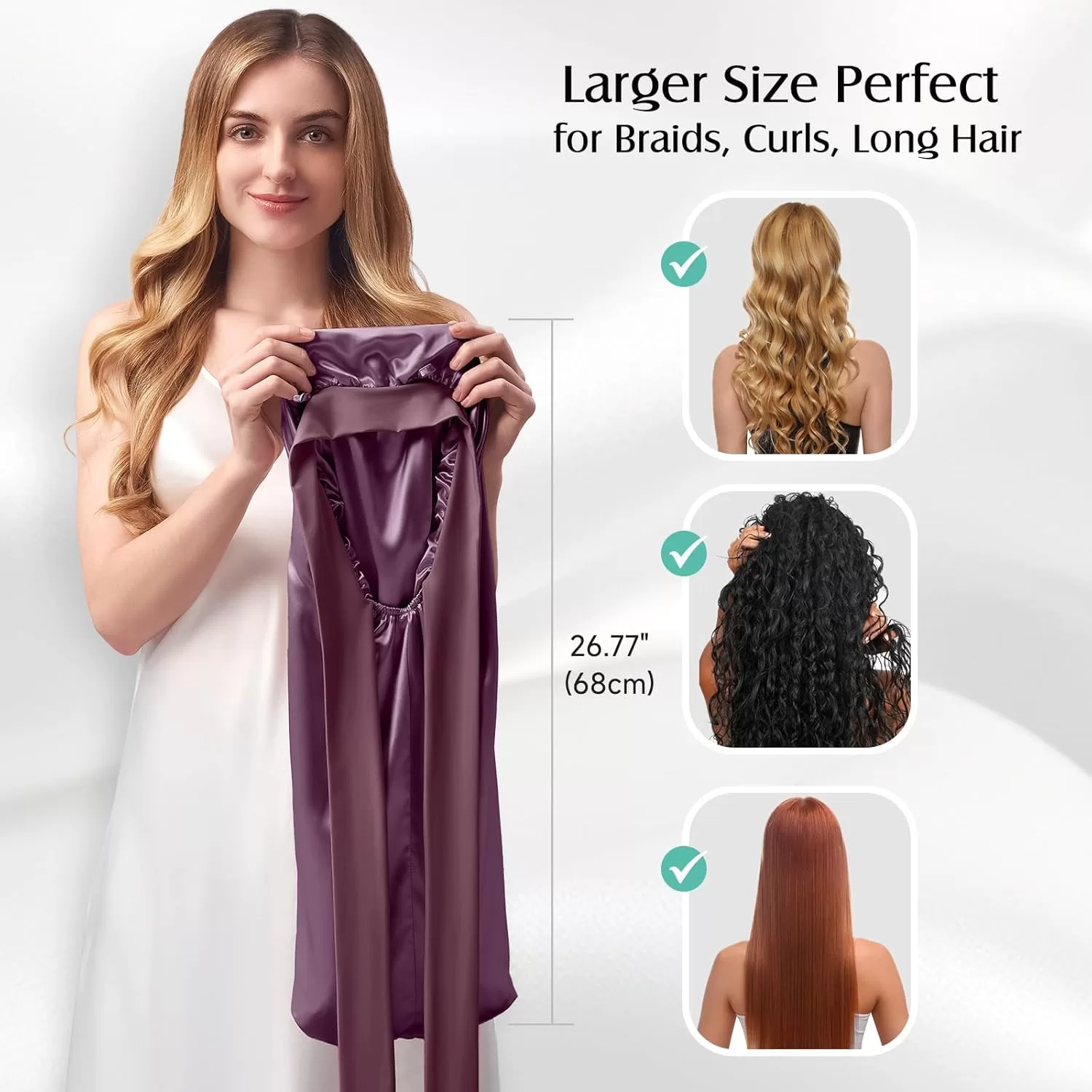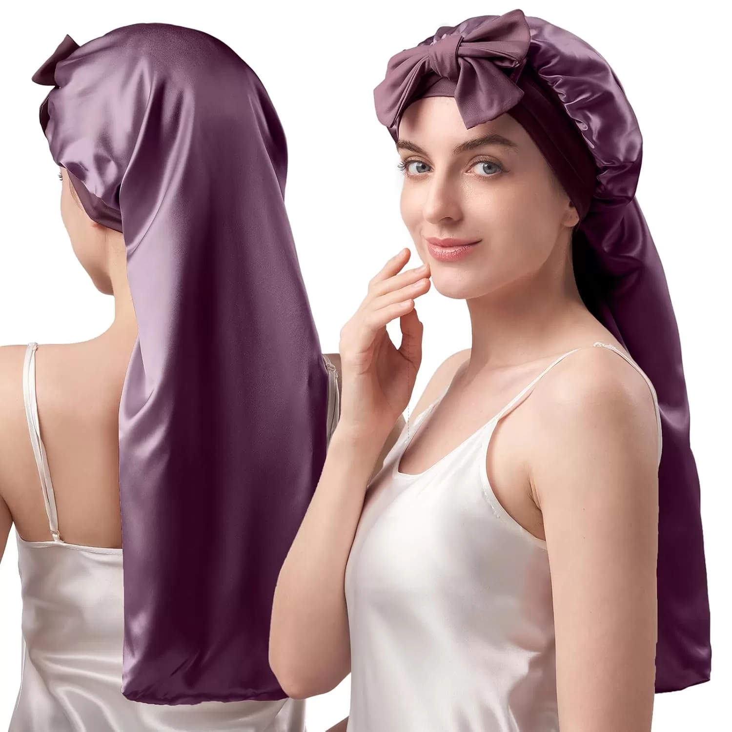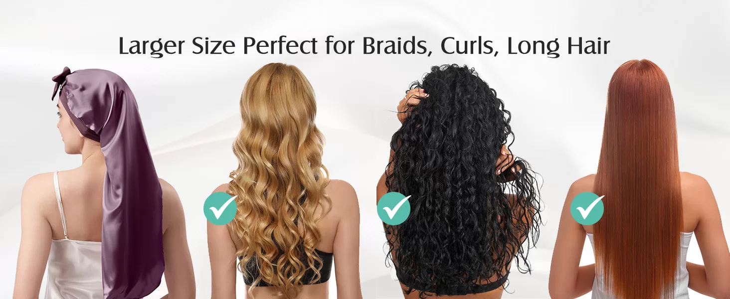 • Long Size Design for Generous Space: 26.77 in/68 cm Longer size hair bonnet can fully cover all hair textures from straight strands to voluminous curls. The elongated design allows locks to lay flat without compression. Unlike standard caps that crush hair, the long roomy interior reduces fiber stress, maintaining blowouts, braids, or natural textures intact, perfect for waist-length tresses, keep styles, or thick manes, fresh hair that flows effortlessly.